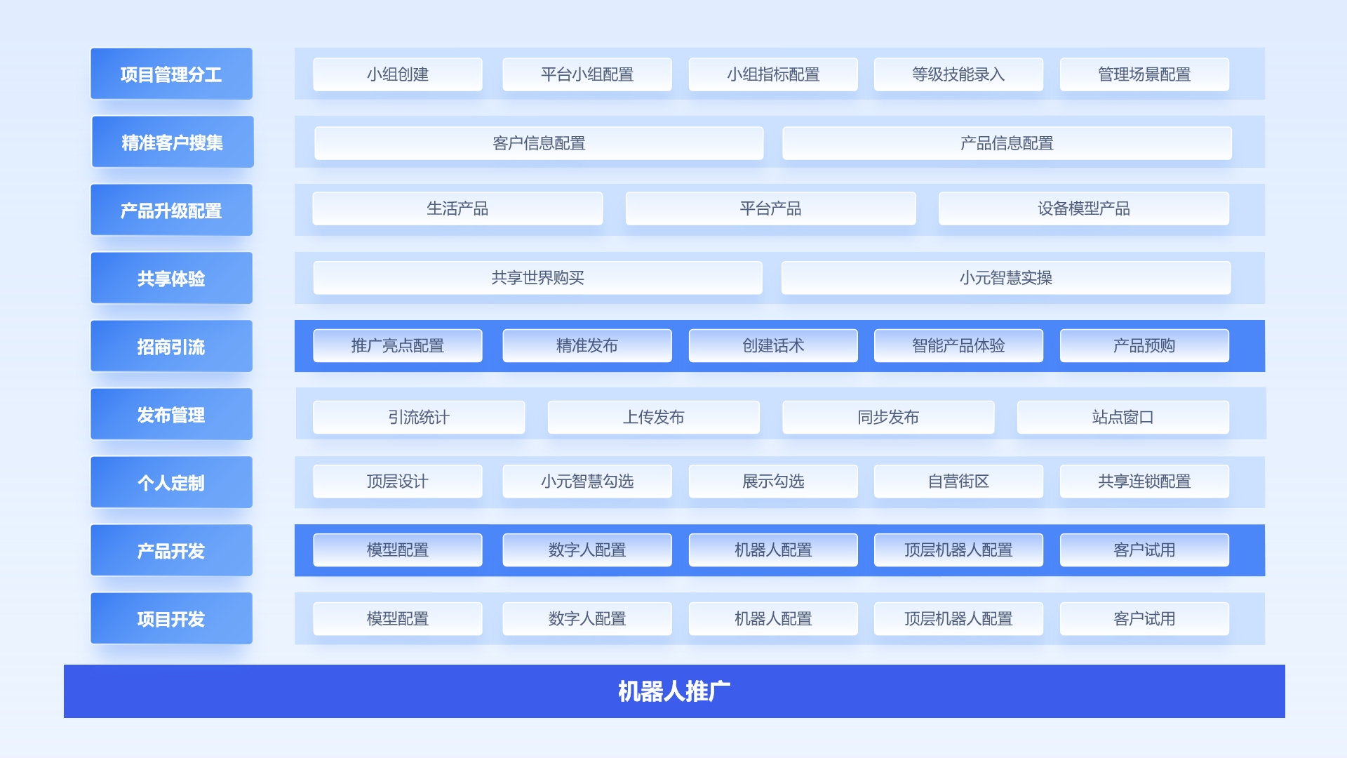 b机器人推广平台由项目管理分工、精准客户搜集、产品升级配置、共享体验、招商引流、发布管理、个人定制、产品开发、项目开发组成。