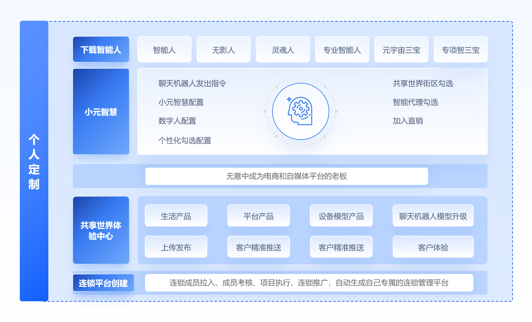j共享世界体验中心:生活产品、平台产品、设备模型产品,人工智能聊天机器人模型升级、上传发布、客户精准推送,客户体验、自动生成自己专属的共享世界体验中心;