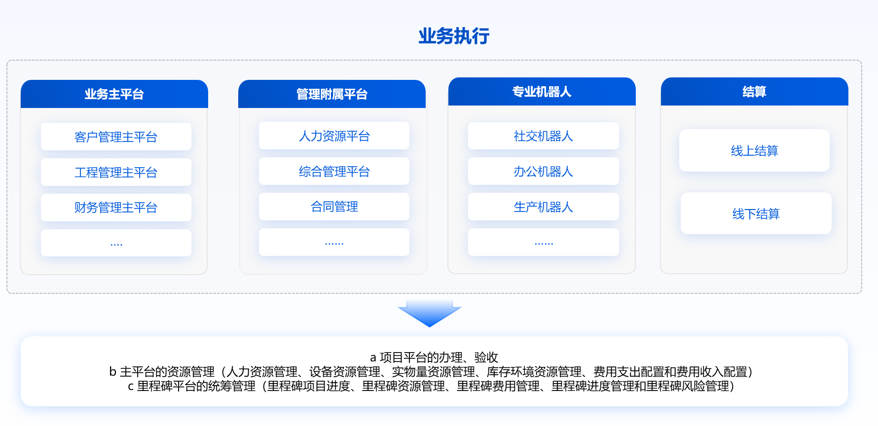 a通过主业务平台、多个AI专业平台和多个专业机器人的融合配置,装备自己的机器人大脑,用于项目平台的办理、验收;